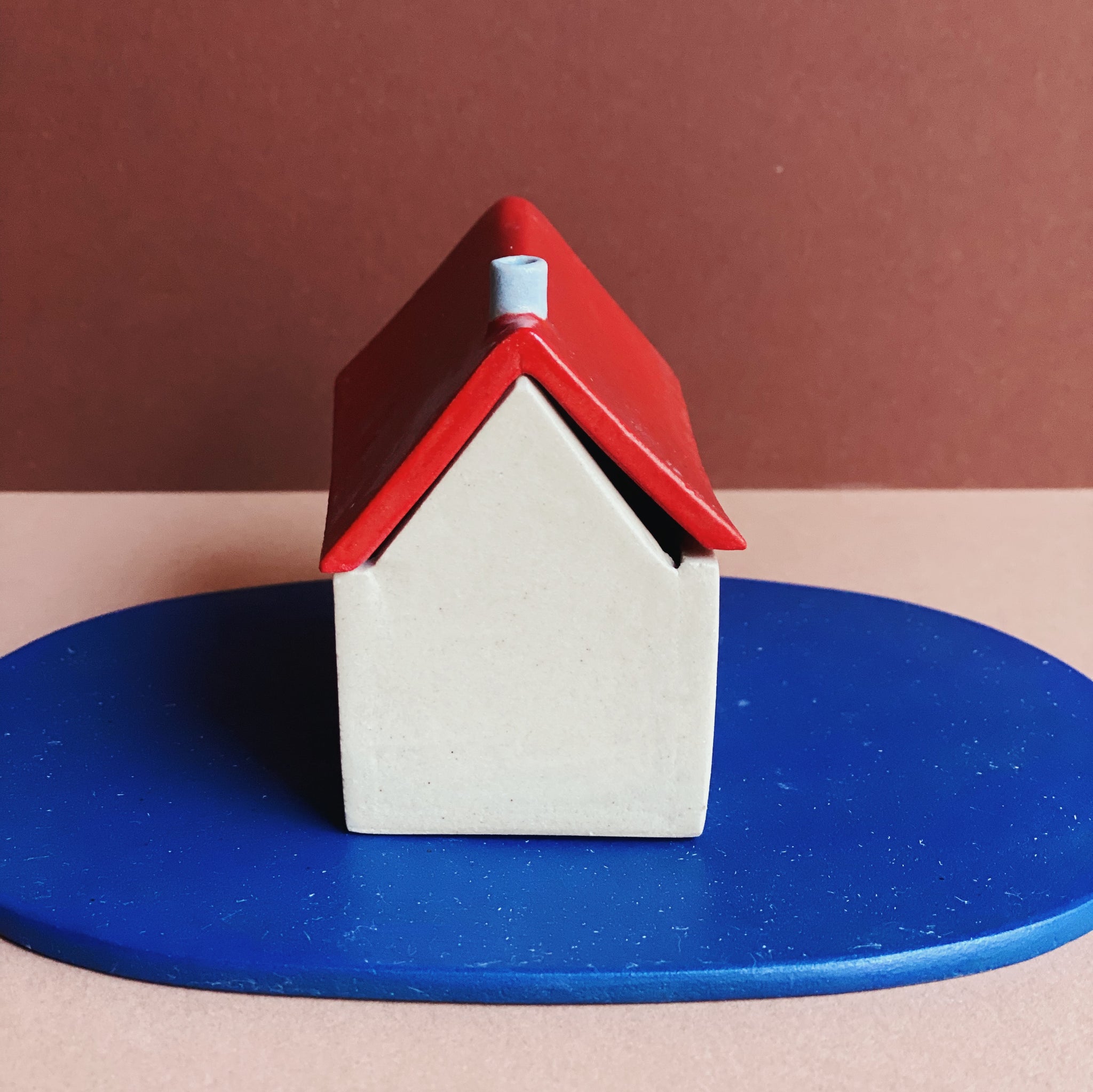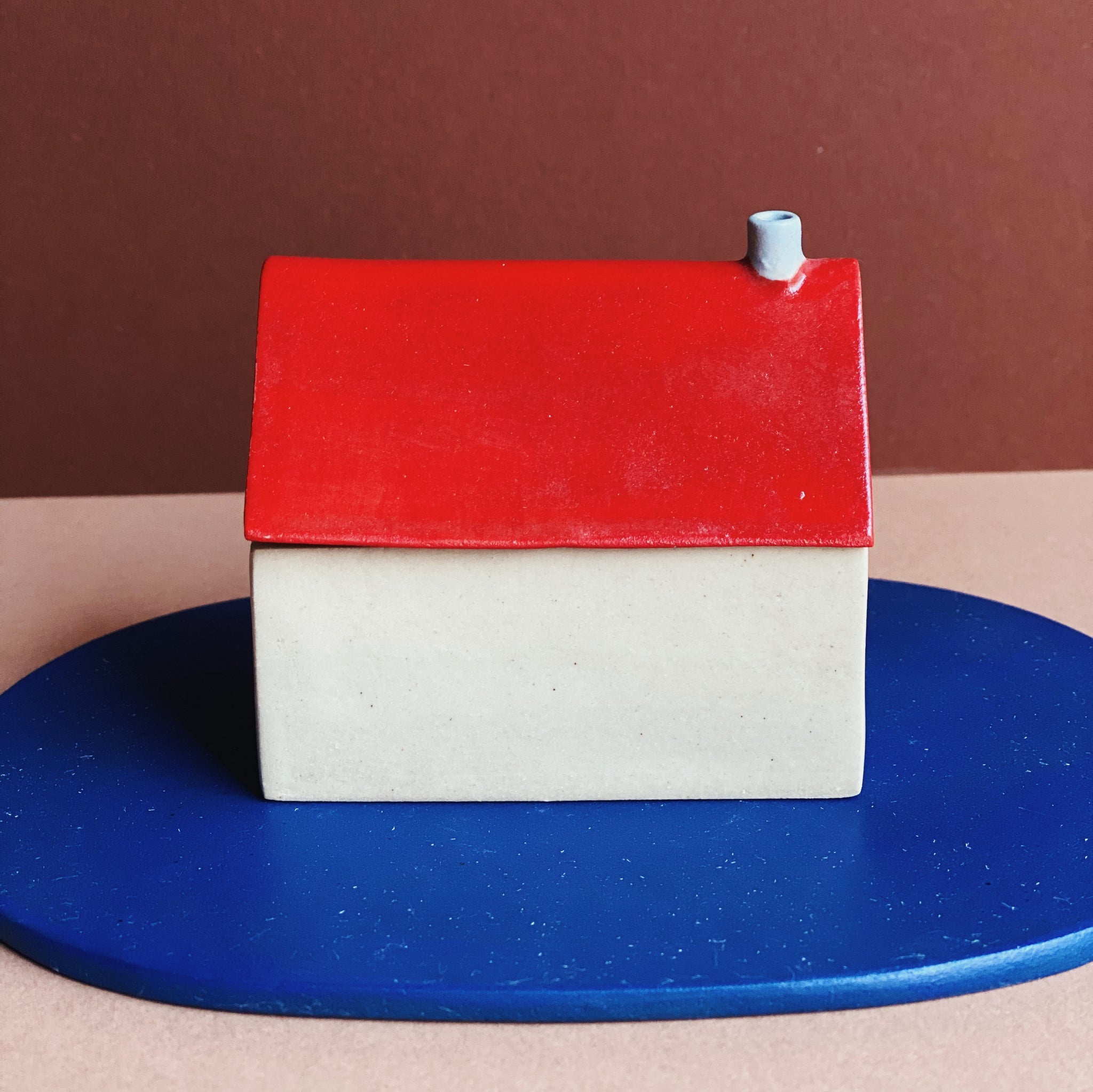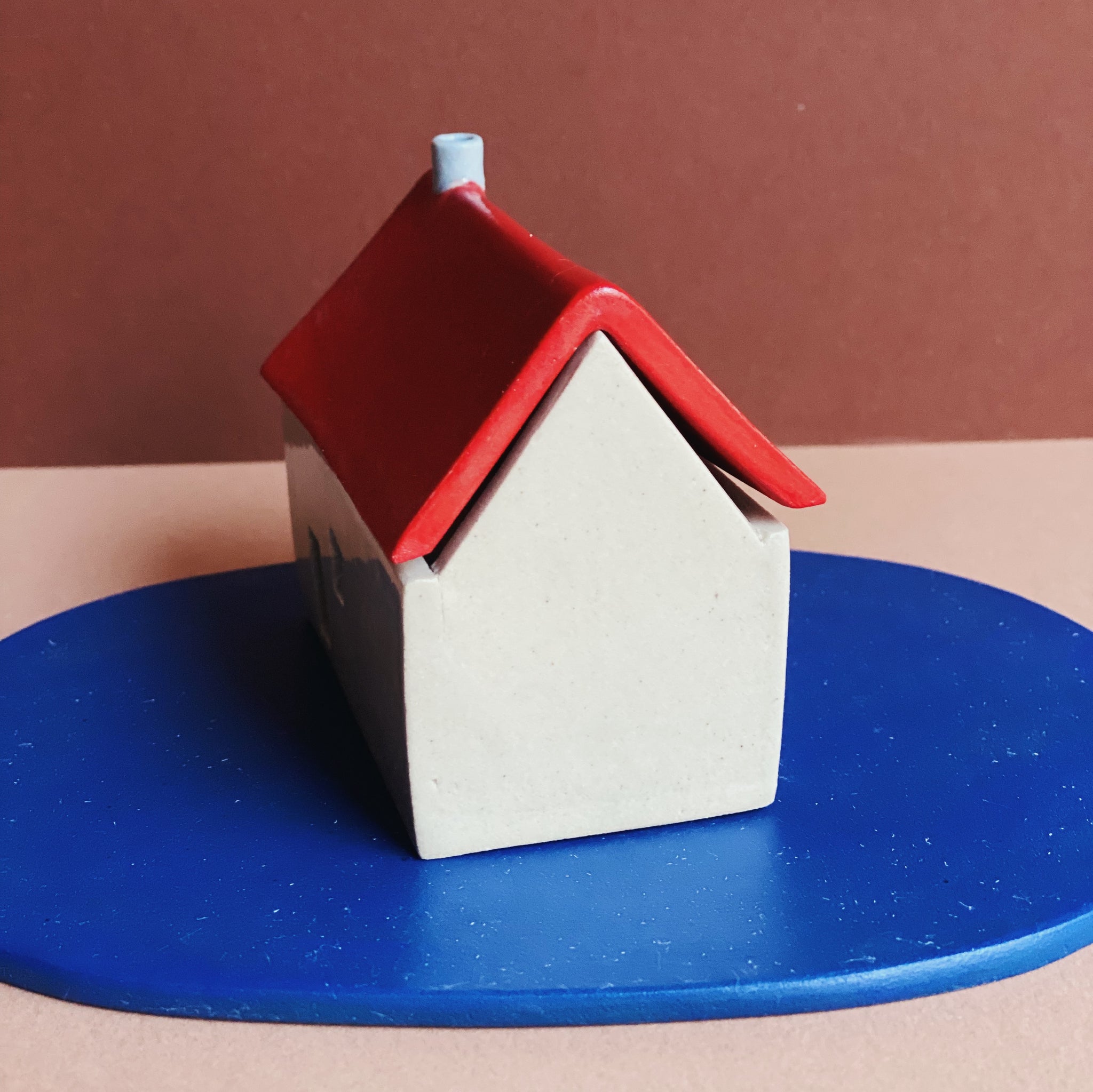 Handgefertigtes Häuschen aus Steinzeug, illustriert mit farbigen Engoben und Unterglasuren und einem Finish aus transparenter, glänzender Glasur. Jedes Häuschen wird in einem eigens dafür gestalteten Karton und einer kleinen Überraschung versendet.