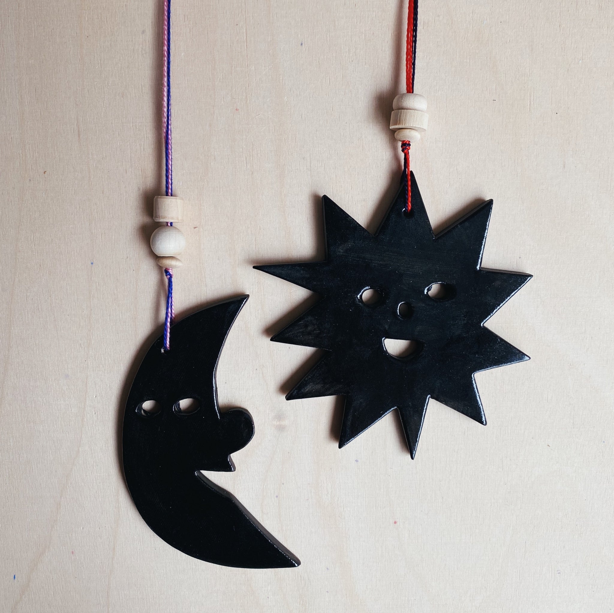 Ein Mond aus Keramik, beidseitig farbig gestaltet. Vorderseite glasiert, Rückseite matt. Mit individuell zusammengestellten Vintage Holzperlen. Jeder Mond ist ein kleines Unikat. Sieht sowohl als Wand- wie auch als Baumschmuck toll aus.