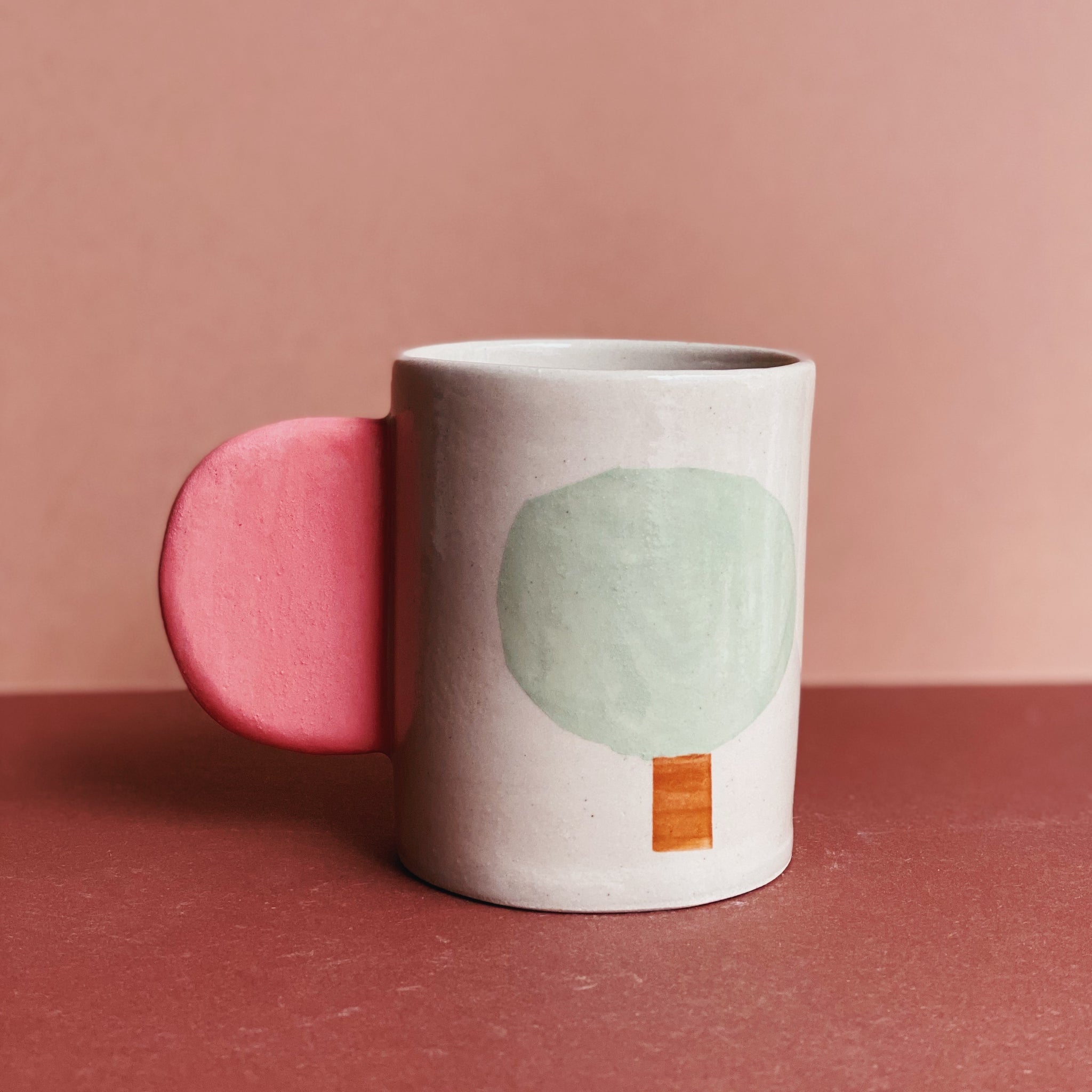 Tassen-Studie mit bunter Illustration und einem Finish aus klarer Glasur. Gebrannt bei 1240 Grad.
