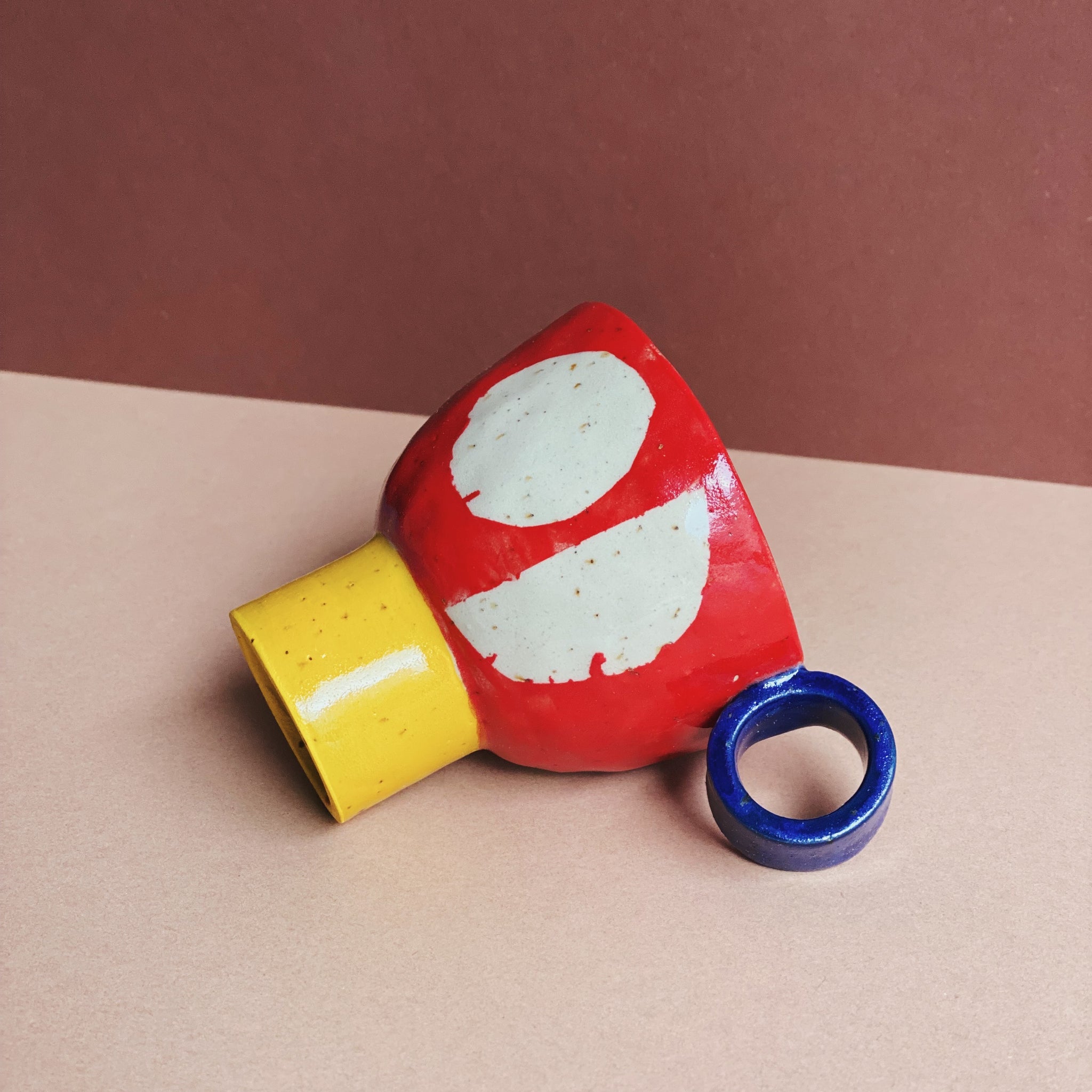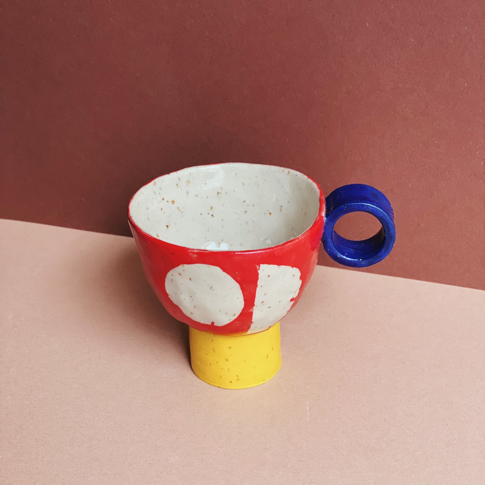 Tassen-Studie mit bunter Illustration und einem Finish aus klarer Glasur. Gebrannt bei 1240 Grad.